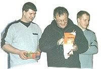 Meine Wenigkeit bekam etwas Warmes fuer den Kopf und Manni brauchte wohl eine gewisse Zeit um zu erkennen was er da gewonnen hatte. Und so hatten wir alle unsere Pokale, Preise und Geschenke an den Mann gebracht. Stefan gewann die Top-Rolle und Thommi die Spinnrute. Enrico gewann den Singenden Fisch. Und zum Schluss unserer Veranstaltung hatten wir dank einiger Runden einen netten und gemuetlichen Ausklang unserer Weihnachtsfeier 2000.